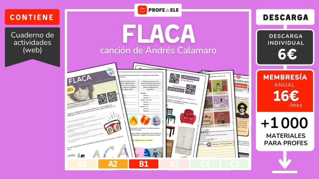 Ahora vas a escuchar la canción titulada Flaca de Andrés Calamaro. En ella aparecerán verbos en imperativo. Presta atención, completa esta actividad en Lyricstrainning y después vuelve a ProfeDeELE para seguir con el resto de actividades.