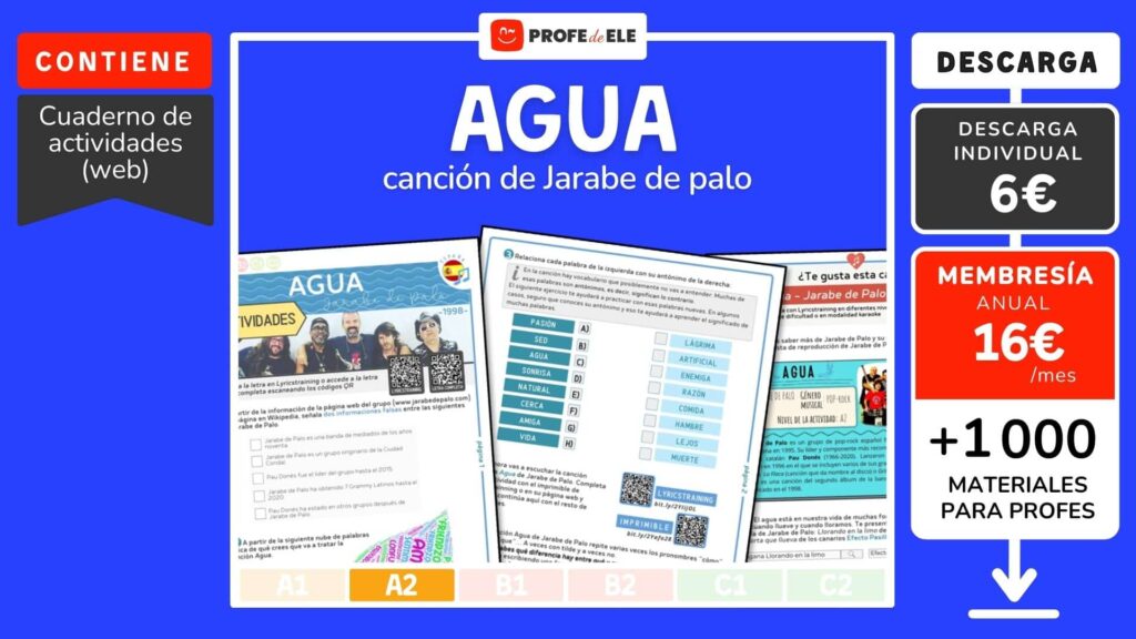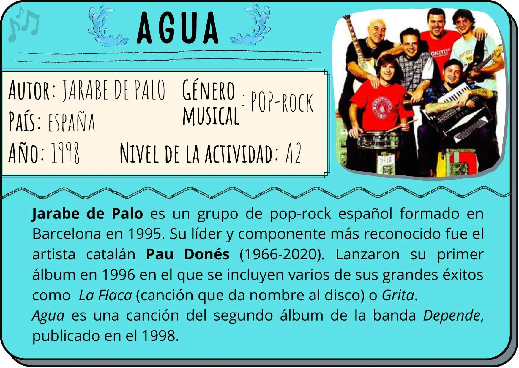 Ahora vas a escuchar la canción titulada Agua de Jarabe de Palo. Completa esta actividad en Lyricstrainning y después vuelve a ProfeDeELE para seguir con el resto de actividades.