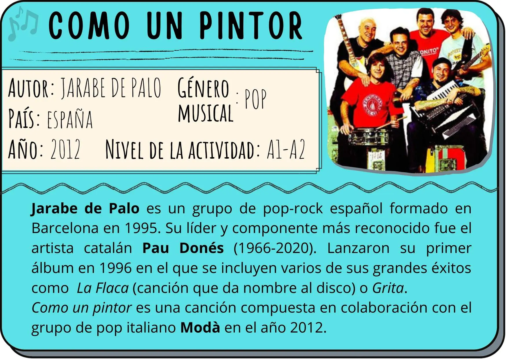 Ahora vas a escuchar la canción titulada Como un pintor de Jarabe de Palo & Modà. En ella practicarás los colores. Completa esta actividad en Lyricstrainning y después vu...
