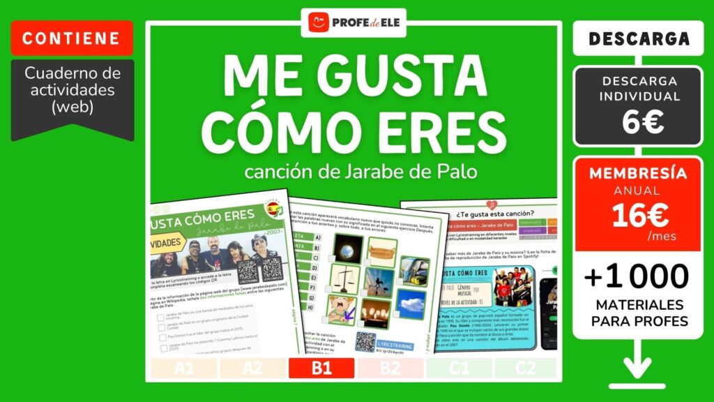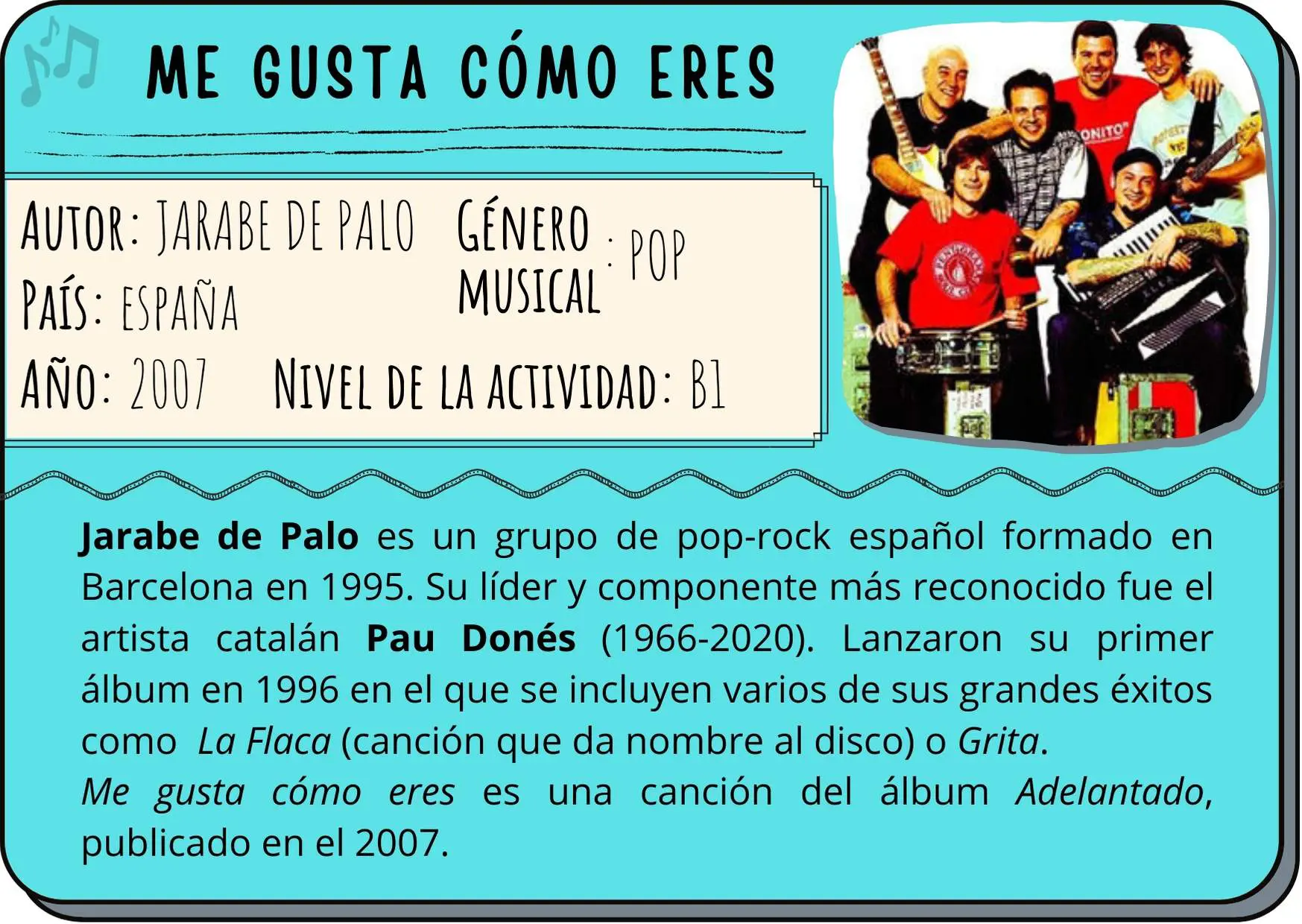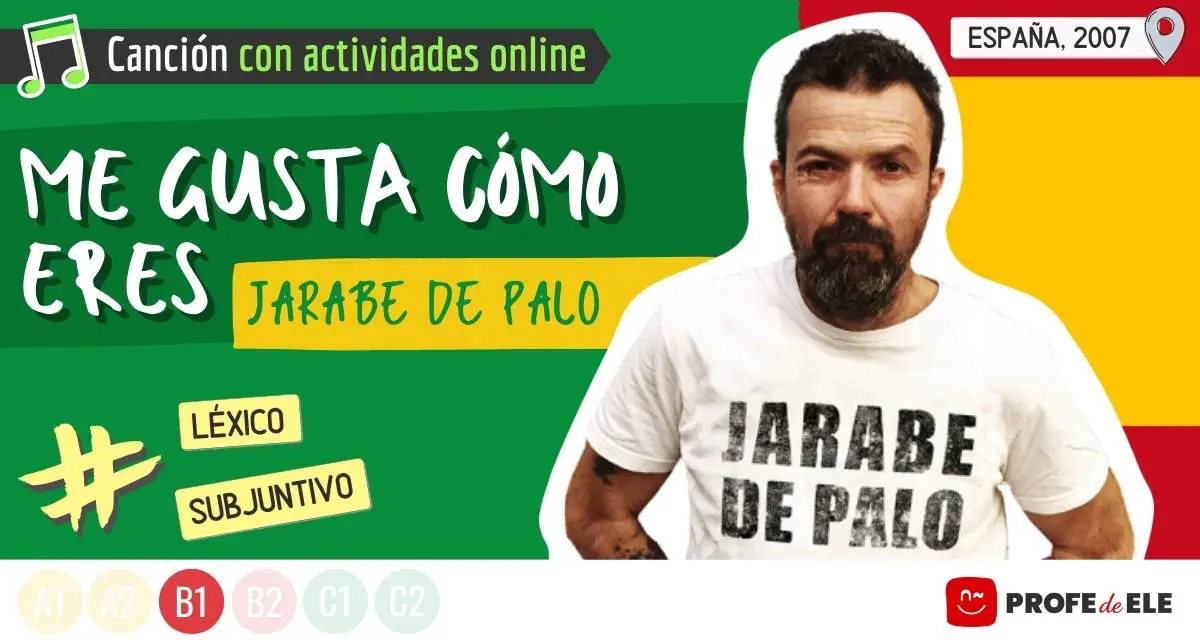 Ahora vas a escuchar la canción titulada Me gusta cómo eres de Jarabe de Palo. Completa esta actividad en Lyricstrainning y después vuelve a ProfeDeELE para seguir con el resto de actividades