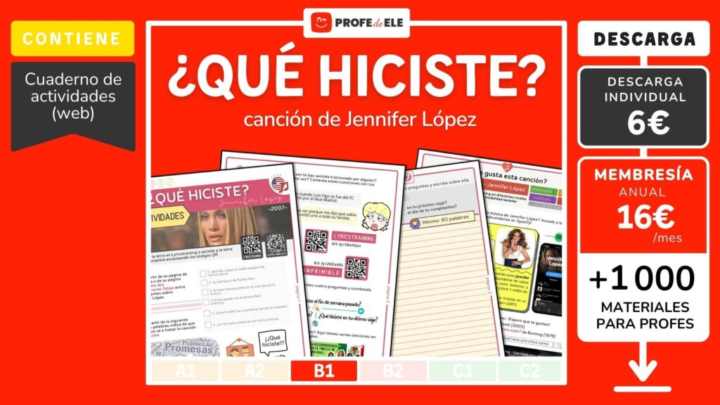 Ahora vas a escuchar la canción titulada ¿Qué hiciste? de Jennifer López. Presta atención a los verbos en futuro y en pasado, completa esta actividad en Lyricstrainning y después vuelve a ProfeDeELE para seguir con el resto de actividades.