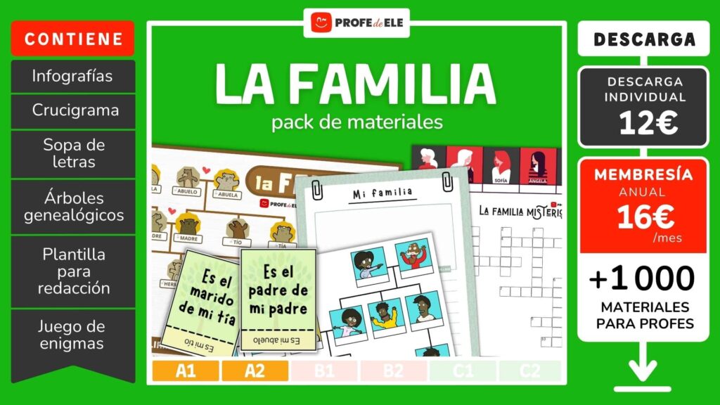 Estas 9 actividades proporcionan una estructura completa para explorar y practicar un tema de lengua frecuente en la clase de español. Además de las actividades online, en los materiales complementarios descargables disponibles encontrarás un cuadernillo con las actividades de la web maquetados en PDF además de la infografía y juegos extra (un crucigrama, una sopa de letras, árboles genealógicos, una plantilla para redacción y un juego de enigmas), lo que permite practicar sin necesidad de conexión a internet y mandar el material como tarea para casa.