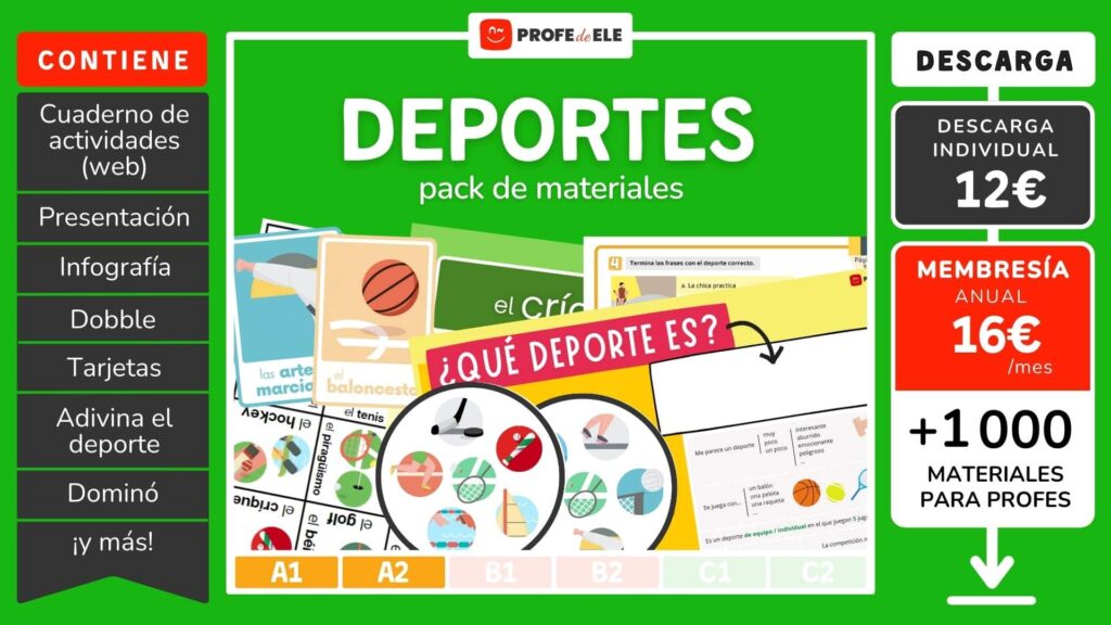 Escucha las descripciones de los deportes y haz clic en el deporte correcto. Si no entiendes todo, ¡no te preocupes! Escucha bien las palabras clave. Te recomendamos anotarlas en un papel.