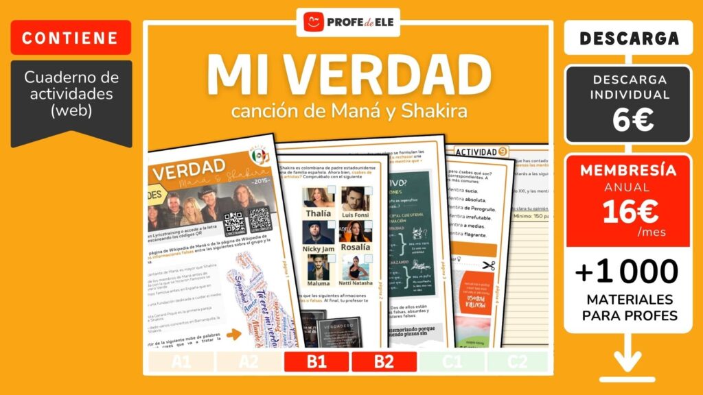 Ahora vas a escuchar la canción titulada Mi verdad de Maná y Shakira. Presta atención, completa esta actividad en Lyricstrainning y después vuelve a ProfeDeELE para seguir con el resto de actividades.