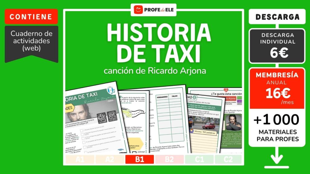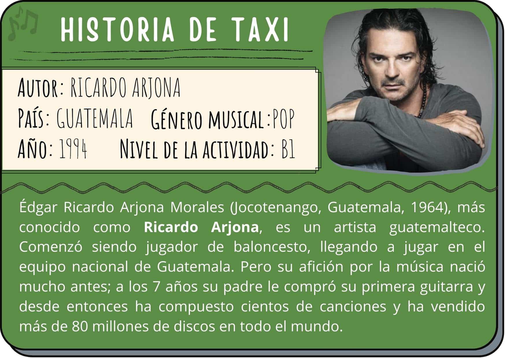 Ahora vas a escuchar la canción titulada Historia de taxi de Ricardo Arjona. Presta atención a los distintos tiempos de pasado y al estilo indirecto, completa esta actividad en Lyricstrainning y después vuelve a ProfeDeELE para seguir con el resto de actividades.